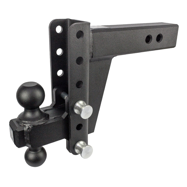 For 2-1/2 Inch Receiver; Lockable (Lock Sold Separate); 36 000 Pound Gross Trailer Weight; Adjustable 6 Inch Drop/ 6 Inch Rise; Non Swivel; Non-Extendable; 9 Inch Shank; With Black Powder Coated Hitch Balls; Dual Ball - 2 Inch and 2 5/16 Inch; Steel; With Hitch Pin